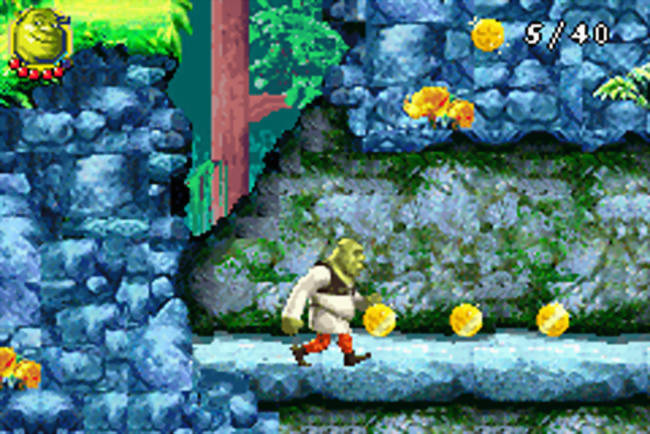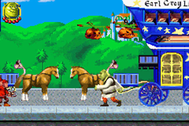 Visually, this game pops on the GBA’s tiny screen. Vicarious Visions nailed the Shrek 2 art style—sprites are crisp, animations are smooth, and the environments capture that fairy-tale-gone-wacky vibe. From Shrek’s swamp to Far Far Away’s glitzy streets, it’s colorful without overwhelming the hardware. Sure, it’s no GBA graphical powerhouse like Golden Sun, but it’s a cut above the usual movie game slop (looking at you, Shrek Swamp Kart Speedway).