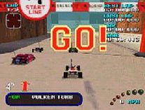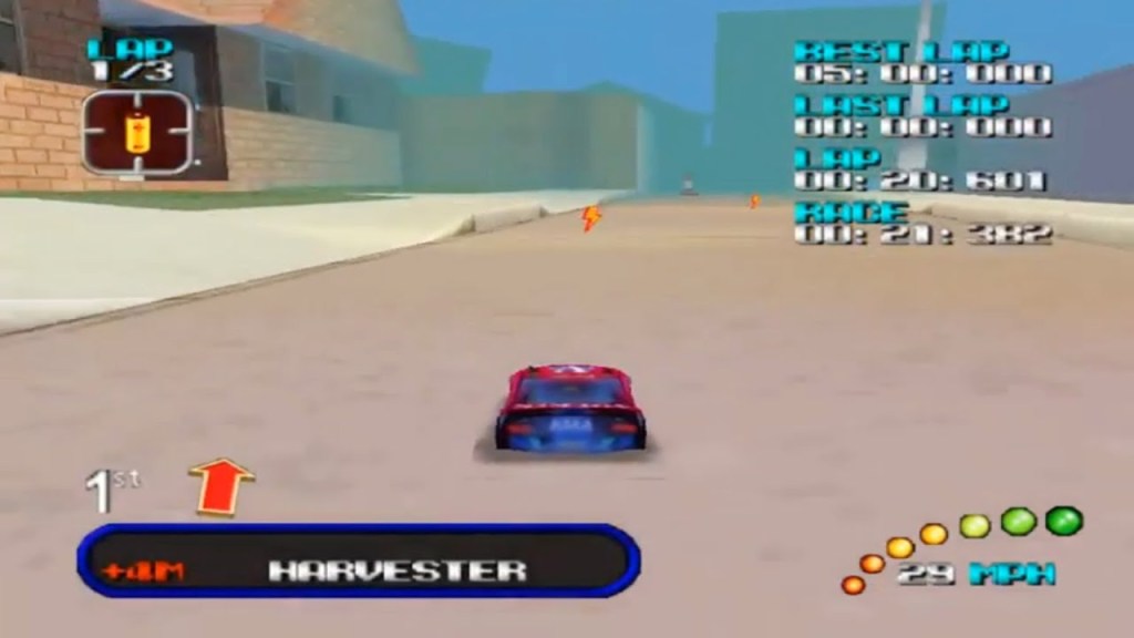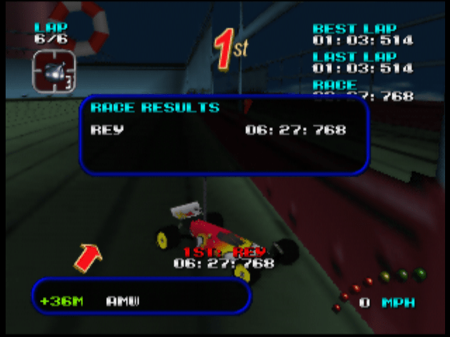 The graphics are fine. The cars don’t look ugly and while the tracks are confusing, I have seen tracks that look worse in other games like Extreme-G. The music during races is forgettable and I have no problems with the sound effects.