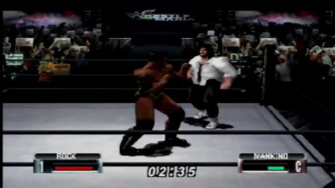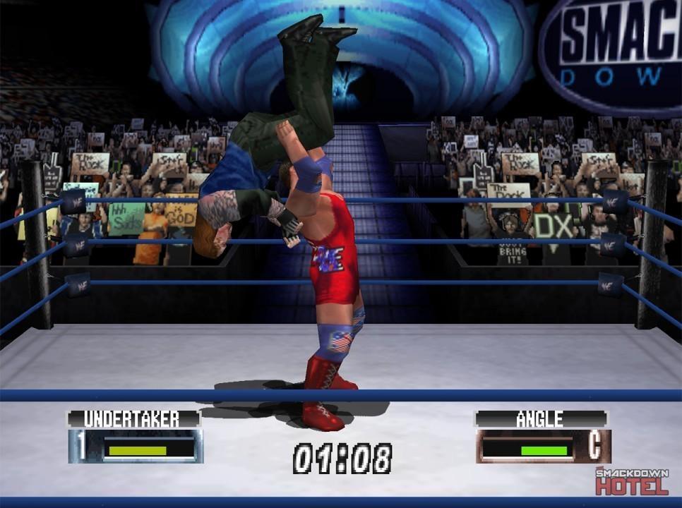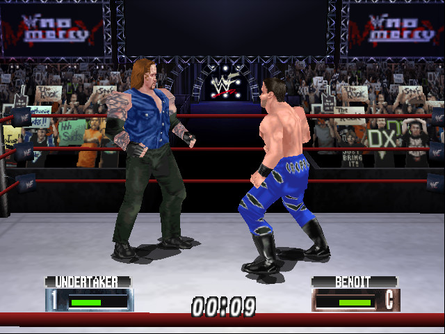 One improvement this game had over WWF Wrestlemania 2000 was when wrestlers dropped weapons. If you dropped a weapon in WWF Wrestlemania 2000, the weapon would fall through the floor and disappear. If you drop a weapon in WWF No Mercy, you can slam the wrestler on the weapon and there is a different sound effect you will hear if you slam a wrestler on a weapon instead of inside or outside of the ring.