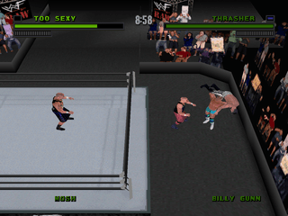 The controls are similar to WWF War Zone. While they still do the same kind of button combinations, they are simpler than WWF War Zone. This is an improvement because if you look at the moves list, while your opponent’s health i yellow or worse, then the moves list will tell you how to do your wrestler’s signature move. The moves list will also tell you how to do your finisher if your opponent’s health is in red. The only drawback is a couple of match types like Survivor Series lock out the move list so you can’t look at it in the middle of a match.