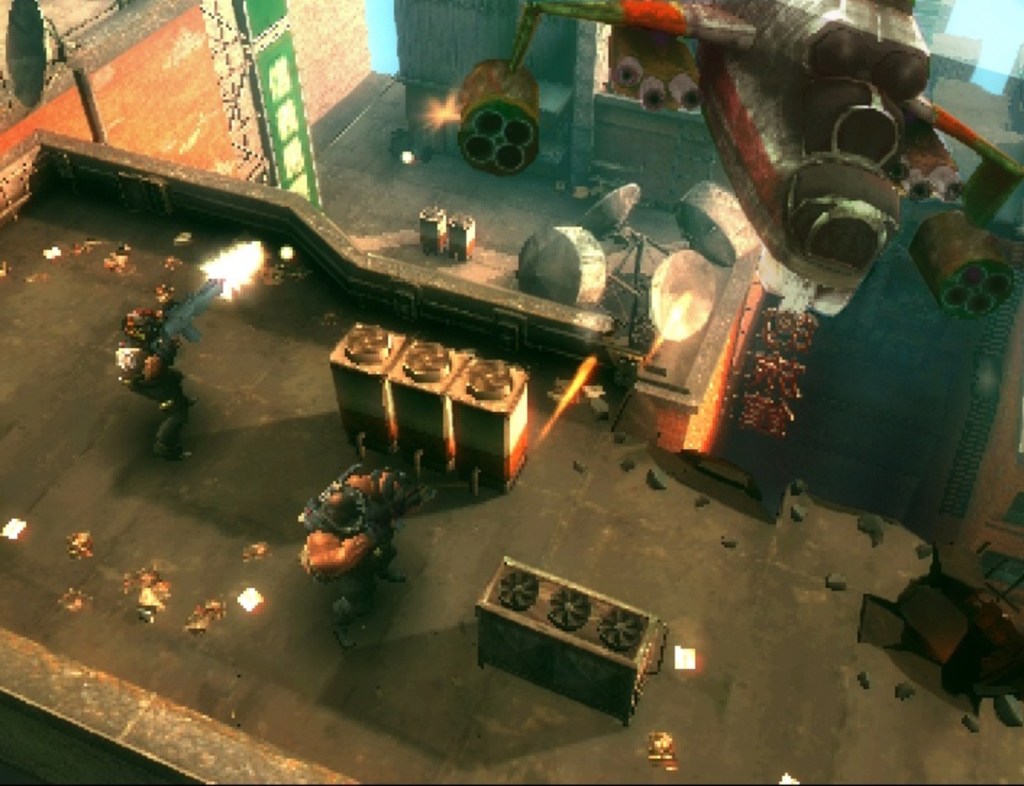 Army of Two is a game where you either progress horizontally or vertically and you kill every enemy in your way. These can range from soldiers to big beefy enemies carrying something like a flamethrower or rocket launcher to vehicles like tanks and helicoptors.