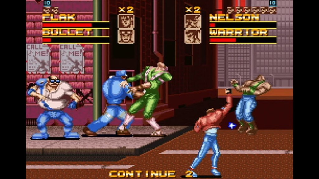 Rival Turf is a side-scrolling beat ’em up where one or two players take on a gang that has kidnapped the girlfriend of one of the protagonists. One advantage over Final Fight is that two players can play cooperatively in this game while Final Fight did not include a cooperative mode. In addition to the main game, two players can take control of the protagonists and fight each other if they want to take a break from the main game.