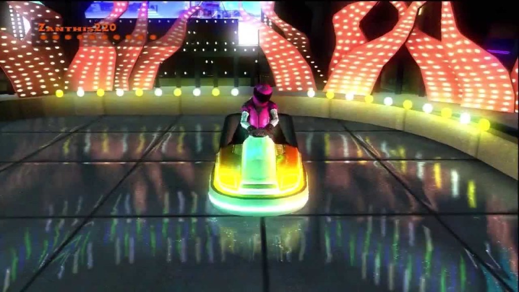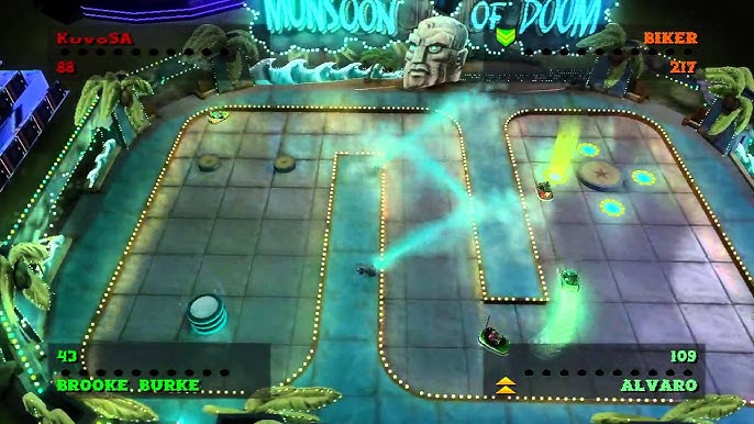 Big Bumpin’ is a collection of mini-games where you and your opponents ride around in bumper carts trying to complete different objectives. These objectives could be winning rounds of Hot Potato, hitting a puck into your opponent’s goal, or trying to knock your opponents off a platform.